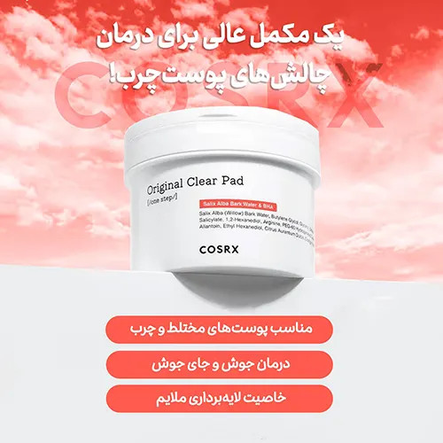 پد پاک کننده صورت ORIGINAL کوزارکس COSRX در هر بسته خود دارای 70 عدد پد صورت می باشد که این پدها به 1 درصد BHA و عصاره درخت بید آغشته هستند. این محصول سلول های مرده سطح پوست را لایه برداری می کند و موجب کاهش و رفع جوش های سرسیاه می گردد. این پد منافذ پوست را به طور عمقی از هرگونه آلودگی و چربی پاک می کند و می تواند برای پاکسازی باقی مانده آرایش نیز موثر واقع شود. این محصول میزان چربی و سبوم پوست را تنظیم می کند و با کاهش تیرکی و قرمزی موجود در پوست، موجب اصلاح رنگ پوست می شود. این محصول از اسیدیته مناسب برخوردار است و نرمی و شادابی را به پوست هدیه می کند.