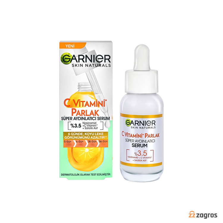 سرم ویتامین سی روشن کننده و ضدلک گارنیر محصول قدرتمند گارنیر حاوی 3.5٪ نیاسینامید + ویتامین C + اسید سالیسیلیک می باشد.